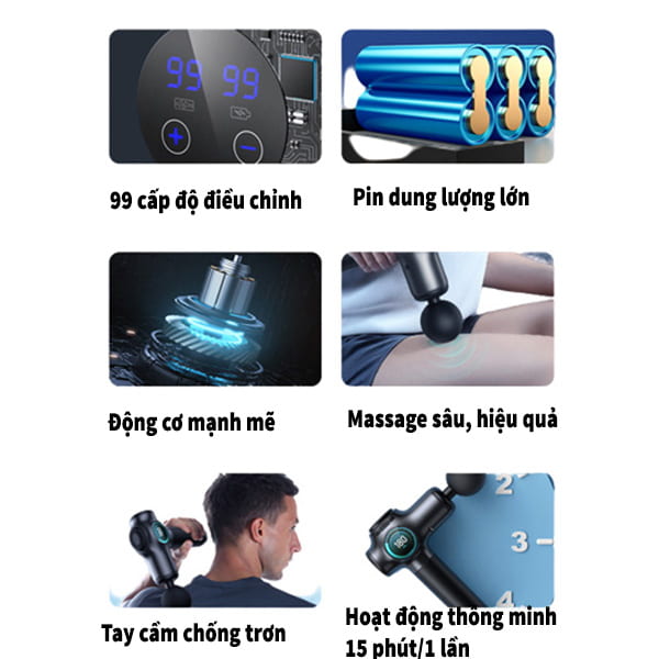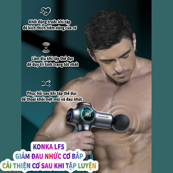 Máy Massage cầm tay Konka LF5 bao gồm 99 lựa chọn tốc độ cho bạn, giúp cơ bắp được Massage sâu, lý tưởng để phục hồi cơ bắp sau khi tập thể dục hoặc sau một ngày làm việc mệt mỏi. Hiệu suất PIN cao: Sản phẩm sử dụng Pin lithium-ion có thể sạc, dung lượng lớn có thể sử dụng lên đến 8-10h, máy sử dụng 15 phút sẽ nghỉ 1 lần.
