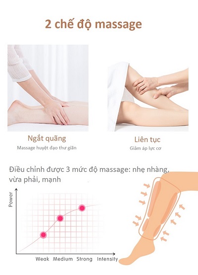 Cơ chế Massage bằng bơm nén khí mô phỏng chuyển động xoa bóp của bàn tay, bao phủ và co bóp toàn bộ phần chân và bàn chân. Kết hợp chế độ làm ấm không những hỗ trợ điều trị hiệu quả đối với người kém lưu thông máu mà còn mang lại cảm giác dễ chịu cho toàn bộ vùng chân.