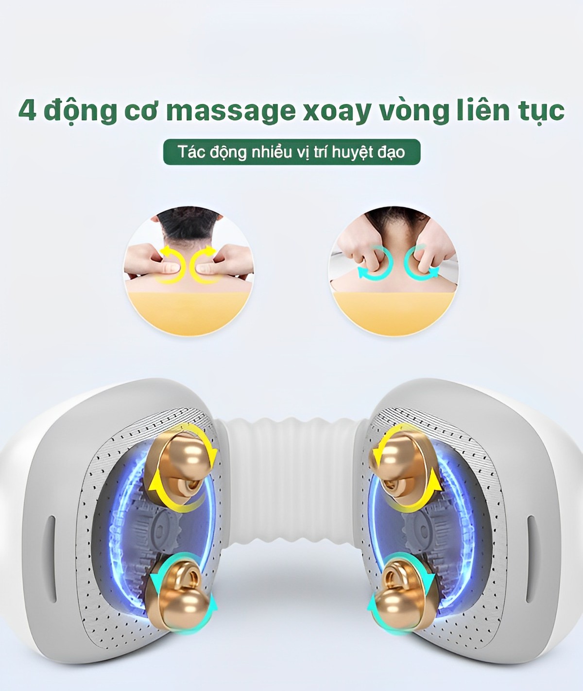 ✤ Đầu Massage thiết kế hình chữ U tương thích với cổ gáy: Các đầu Massage mô phỏng lại phương pháp Shiatsu, xoa bóp nhịp nhàng, uyển chuyển bằng đầu ngón tay tác động vừa đủ lên vùng đau nhức và các vùng cơ. Thiết kế hình chữ U 180 độ phù hợp với vai cổ của mọi người giúp tăng diện tích tiếp xúc và tăng hiệu quả Massage.