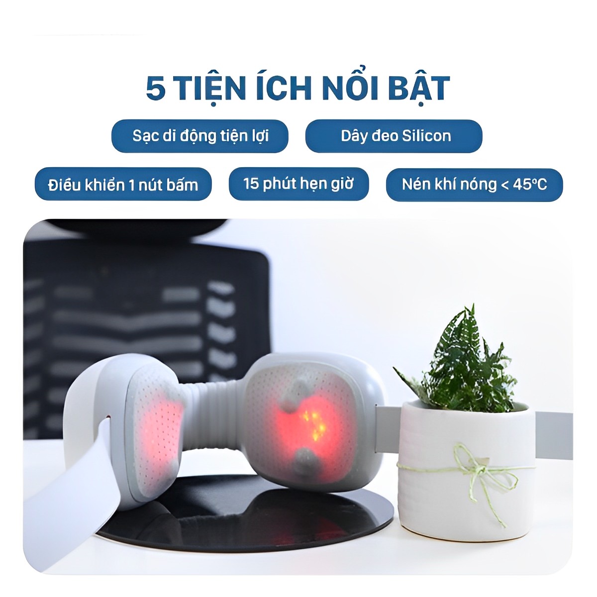✤ Nhiệt độ sưởi nóng ổn định ở mức 45 độ C: Con lăn Massage kết hợp cùng nhiệt sưởi nóng giúp tăng lưu thông khí huyết, thư giãn các đốt sống cổ, hỗ trợ giảm tình trạng chèn ép, đau mỏi xoá bỏ nhanh chóng.