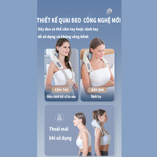 Thiết kế đai đeo tinh tế, không giới hạn tư thế hoạt động. Máy có dây đeo vai chắc chắn giúp bạn có thể vừa làm việc mà vẫn được thư giãn cùng với máy Massage.