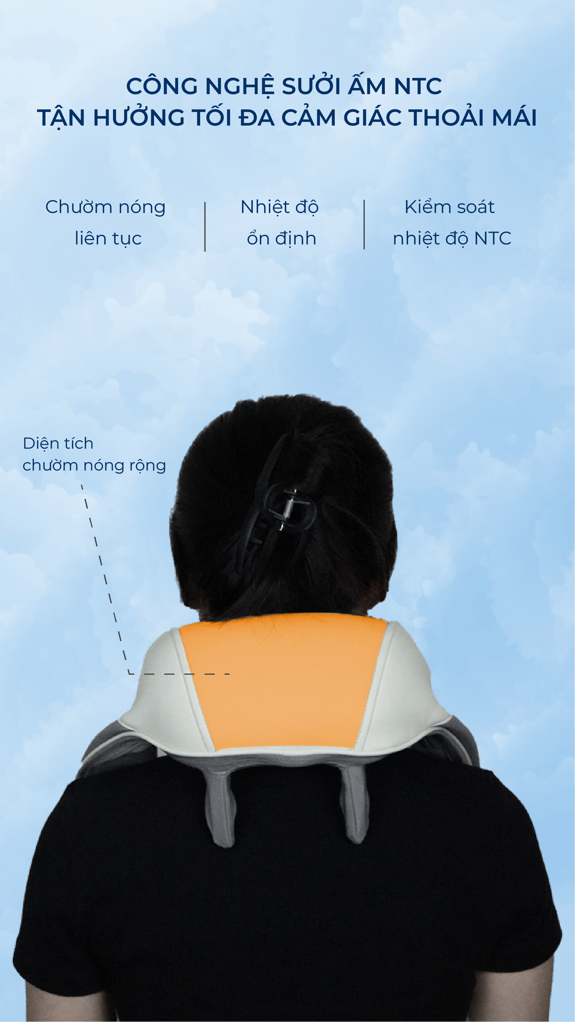 CÔNG NGHỆ SƯỞI ẤM NTC: Chườm nóng liên tục với nhiệt độ ổn định, tác dụng tận sâu và bao quát các vùng cơ xung quanh vai và cổ giúp tăng cường tuần hoàn máu và làm dịu cơ