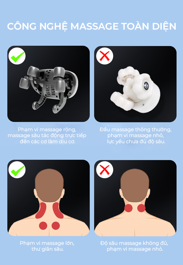 Massage TOÀN DIỆN TỪ CỔ CHO ĐẾN THẮT LƯNG: Massage trong phạm vi rộng mô phỏng theo kỹ thuật Massage nhắm vào các điểm huyệt đạo chữa lành những vùng đau nhức, tê cứng khó chịu tạo cảm giác thư giãn chân thực như được Massage bởi bàn tay của con người