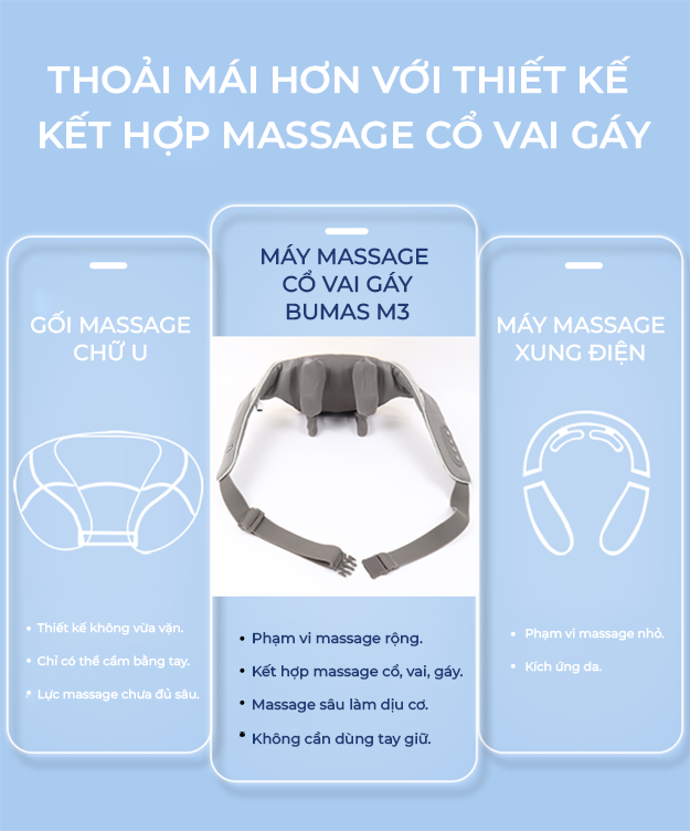 Đau mỏi cổ vai gáy là tình trạng bệnh lý thường gặp ở người già, người làm việc lâu ở một tư thế hay chấn thương ở các mô mềm, không chỉ khiến cho người bệnh cảm thấy mệt mỏi, khó chịu mà còn có thể gây ra nhiều bệnh nguy hiểm về xương khớp. Để chia sẻ nỗi lo này, BUMAS cho ra đời sản phẩm Máy Massage Cổ Vai Gáy Bumas M3 mô phỏng theo các kỹ thuật Massage cổ xưa giúp làm giảm đau cơ, giảm căng thẳng, tăng cường lưu thông máu, cải thiện sức khỏe tổng thế cho người sử dụng và hơn thế nữa Bumas M3 còn giúp bạn tiết kiệm được rất nhiều chi phí khi đi đến những cơ sở Massage thông thường.