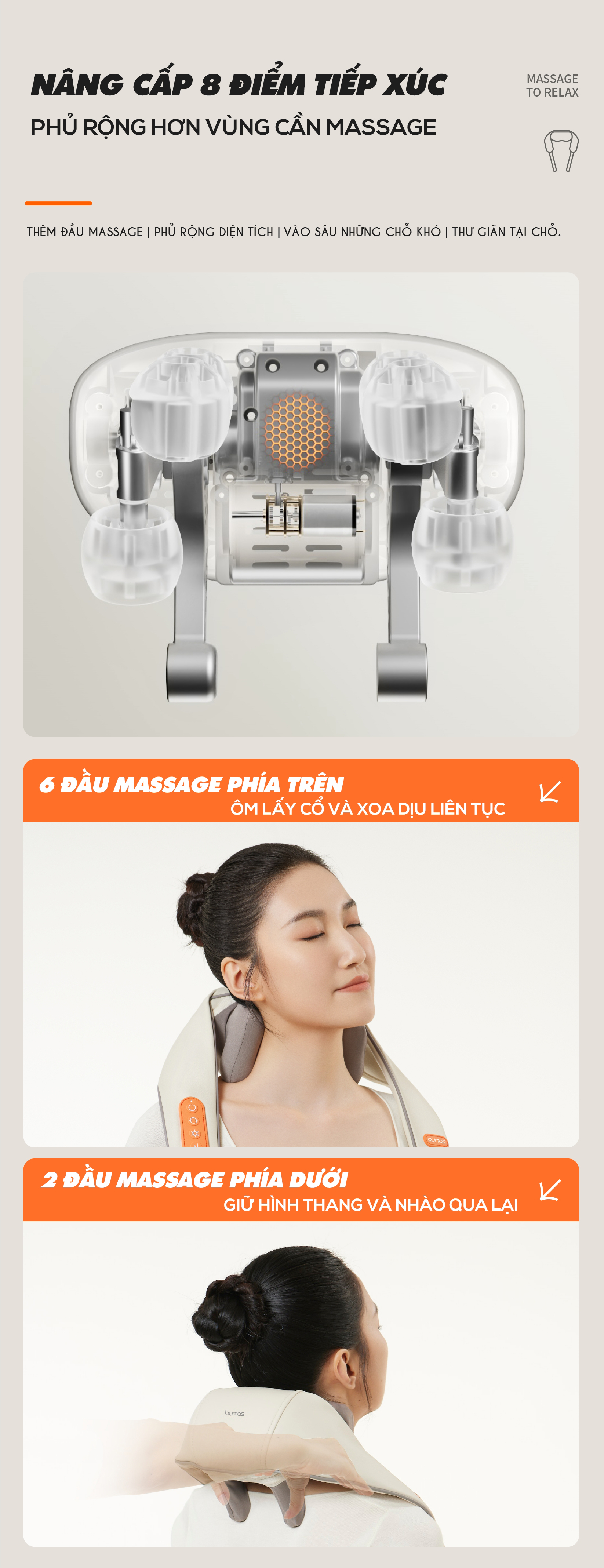 Massage TOÀN DIỆN TỪ CỔ CHO ĐẾN THẮT LƯNG: Bổ sưng 8 đầu Massage trong phạm vi rộng mô phỏng theo kỹ thuật Massage nhắm vào các điểm huyệt đạo chữa lành những vùng đau nhức, tê cứng khó chịu tạo cảm giác thư giãn chân thực như được Massage bởi bàn tay của con người