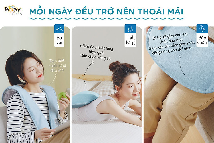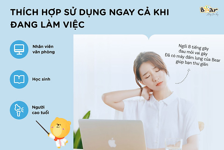 Sở hữu thiết kế thông minh, tác dụng thư giãn hoàn hảo máy đấm lưng Bear là sản phẩm thích hợp cho nhiều người dùng khác nhau. Nhân viên văn phòng, học sinh, phải ngồi lâu khi sử dụng máy sẽ làm giảm mệt mỏi, công việc trở nên nhẹ nhàng, làm việc và học tập hiệu quả hơn. Người cao tuổi: Máy Massage giúp tận hưởng cảm giác thư giãn tuyệt vời, giảm đau mỏi vai gáy và đau nhức cơ vô cùng tốt.