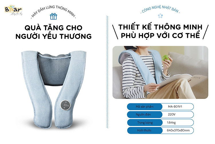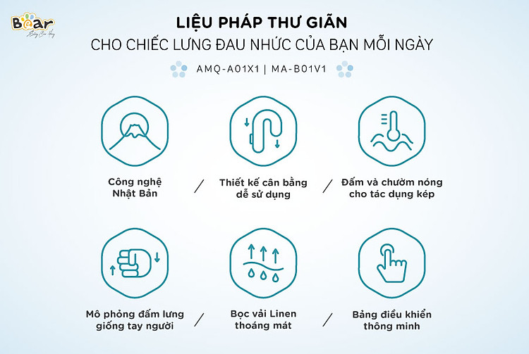 Máy đấm lưng Bear AMQ-A01X1 (MA-B01V1) thiết kế dạng đai cân bằng thông minh, sử dụng công nghệ Nhật Bản mô phỏng chân thật nhất phương pháp đấm Massage như tay người giúp bạn thư giãn vùng cổ, vai gáy, thắt lưng và đùi nhanh chóng và hiệu quả nhất.