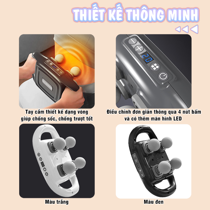 Máy Massage cầm tay Nikio NK-272 được thiết kế tay cầm thiết kế dạng vòng giúp chống sốc, chống trượt tốt. Các chế độ được điều chỉnh đơn giản thông qua 4 nút bấm và có thêm màn hình LED hiển thị cho người dùng dễ quan sát. Sản phẩm được thiết kế với kiểu dáng sang trọng, màu sắc tối giản tạo nên sự tinh tế và hiện đại. Máy matxa cầm tay Nikio NK-272 hiện có 2 màu cho người dùng lựa chọn: Trắng và đen.