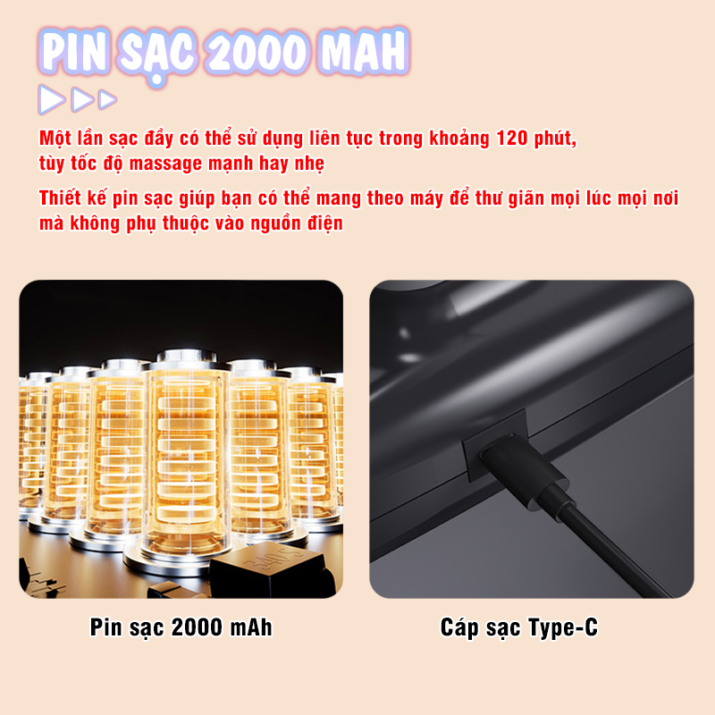 Nikio NK-272 sử dụng pin sạc Li-ion dung lượng lớn 2000 mAh. Một lần sạc đầy có thể sử dụng liên tục trong khoảng 120 phút, tùy tốc độ Massage mạnh hay nhẹ. Thiết kế pin sạc giúp bạn có thể mang theo máy để thư giãn mọi lúc mọi nơi mà không phụ thuộc vào nguồn điện. Pin sạc nhanh và đơn giản thông qua cáp sạc Type C.