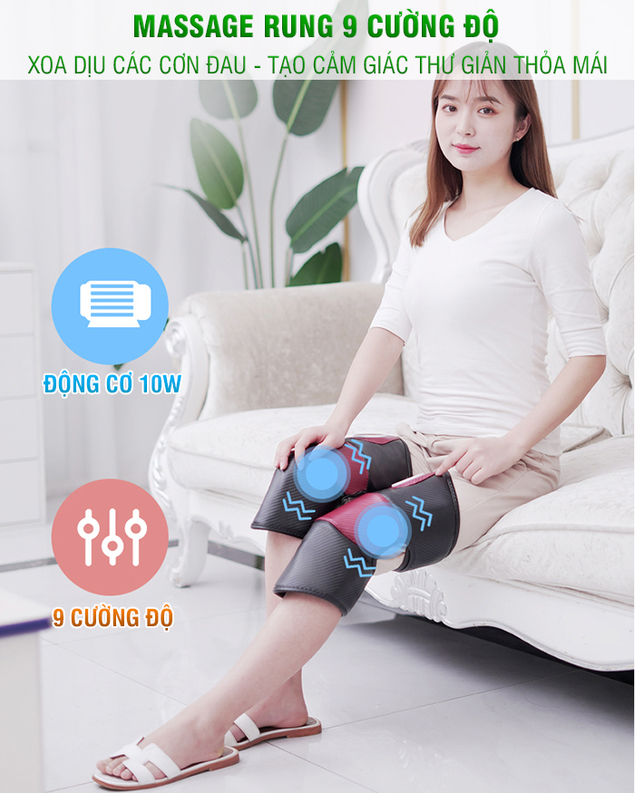 Máy sử dụng động cơ kép hoạt động với công suất 10W để tạo ra lực rung mạnh mẽ giúp xoa bóp nhẹ nhàng vùng đầu gối, kích thích tuần hoàn máu, xoa xịu các cơ tạo cảm giác dễ chịu và tăng sự linh hoạt cho khớp gối. Tính năng rung được chia thành 9 kiểu rung kết hợp với 9 mức cường độ mạnh nhẹ đáp ứng nhiều nhu cầu sử dụng khác nhau.