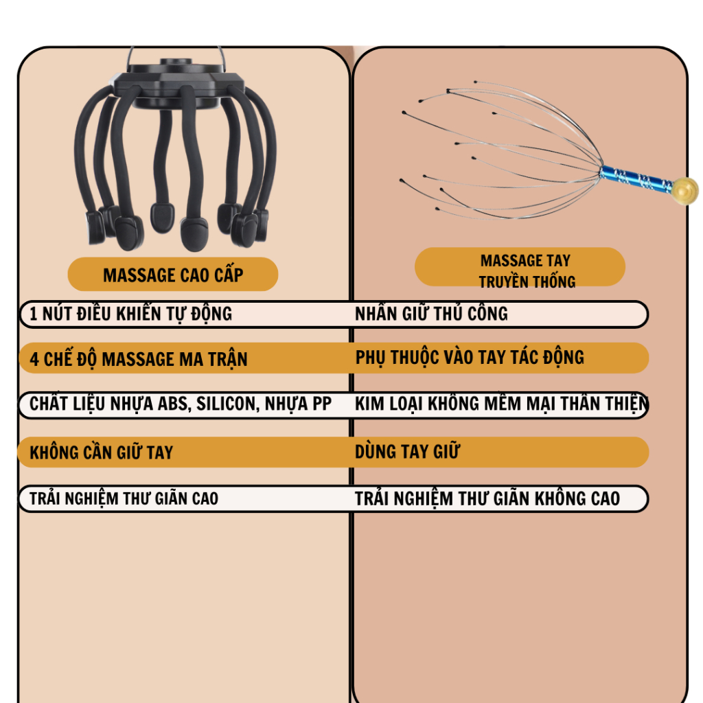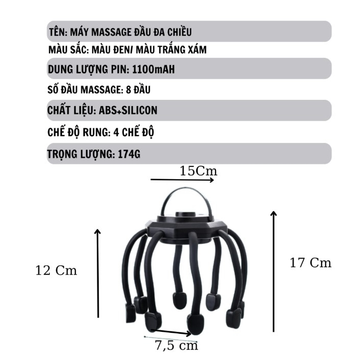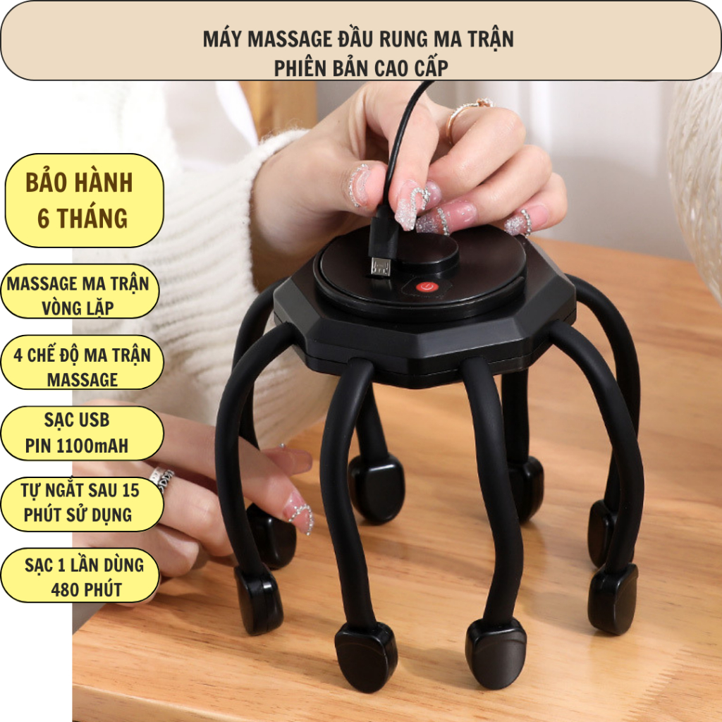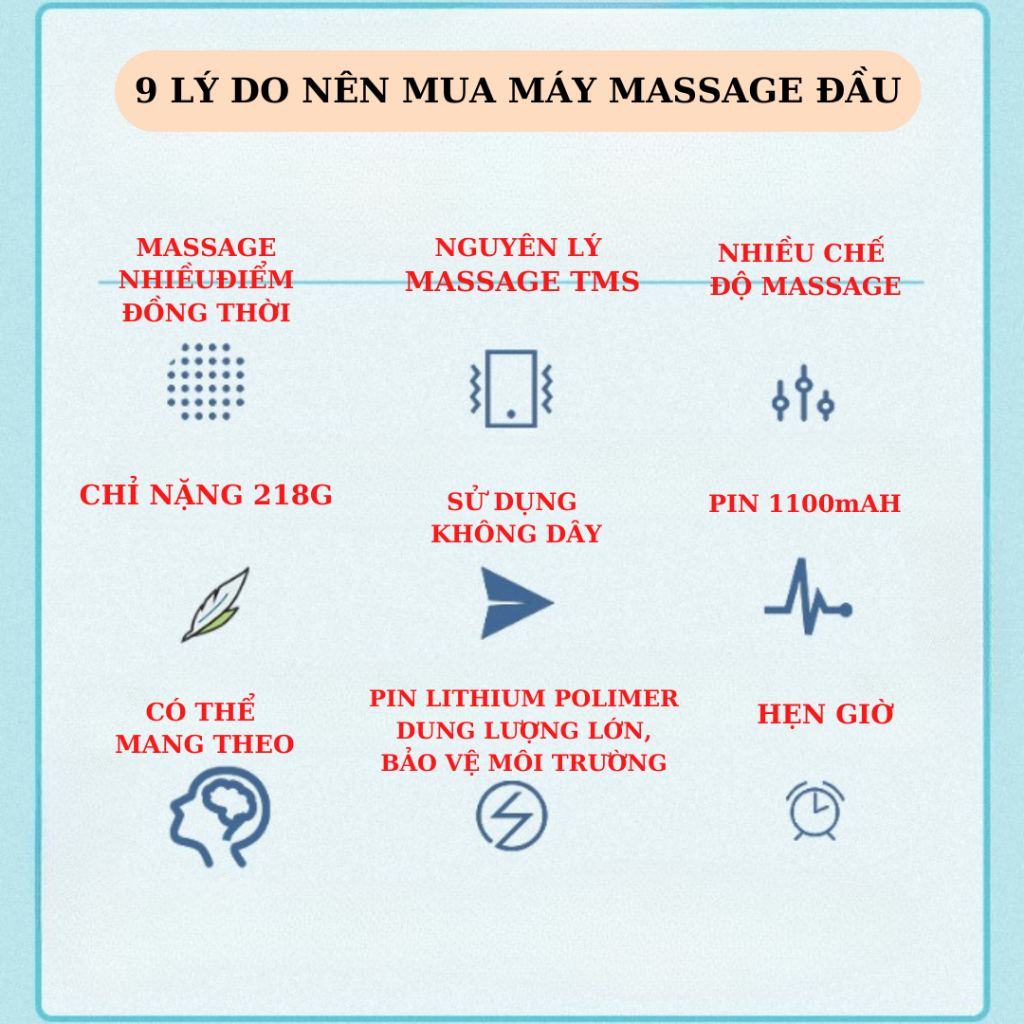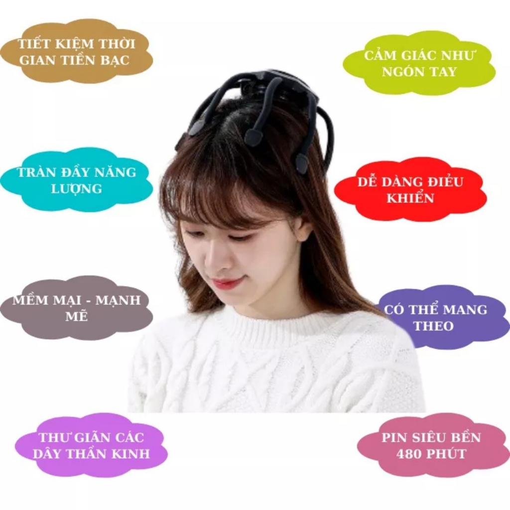 - Massage, rung mô phỏng các đầu ngón tay tròn mềm mại vuốt ve, Massage tại nhiều điểm trên đầu tạo cảm giác thư giãn, thả lỏng thoải mái sau ngày dài làm việc