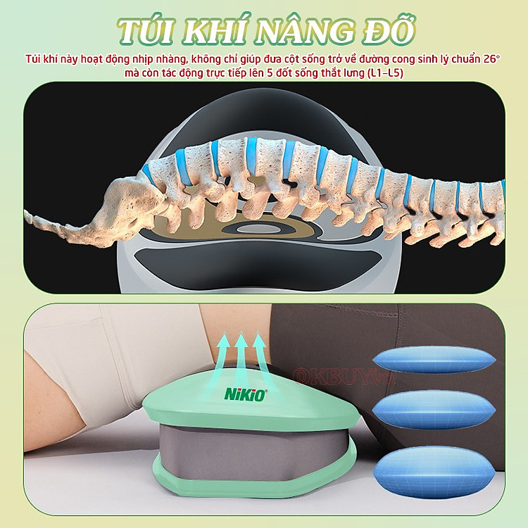 Một điểm mạnh nổi bật của máy matxa lưng Nikio NK-159 chính là túi khí nâng đỡ thông minh. Túi khí này hoạt động nhịp nhàng, không chỉ giúp đưa cột sống trở về đường cong sinh lý chuẩn 26° mà còn tác động trực tiếp lên 5 đốt sống thắt lưng (L1–L5) giúp: