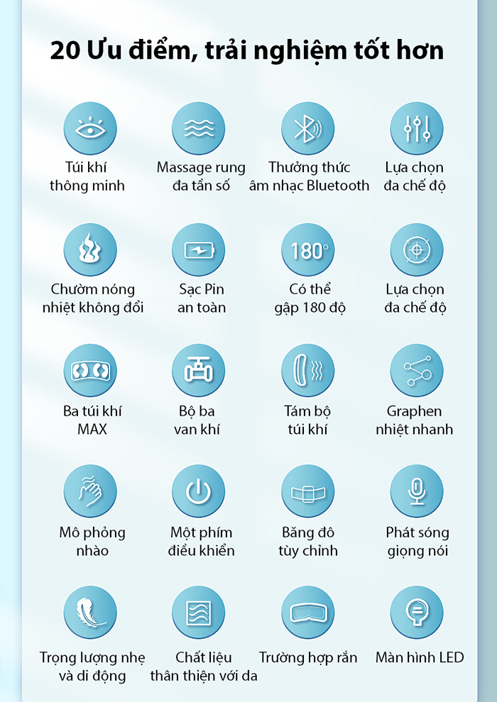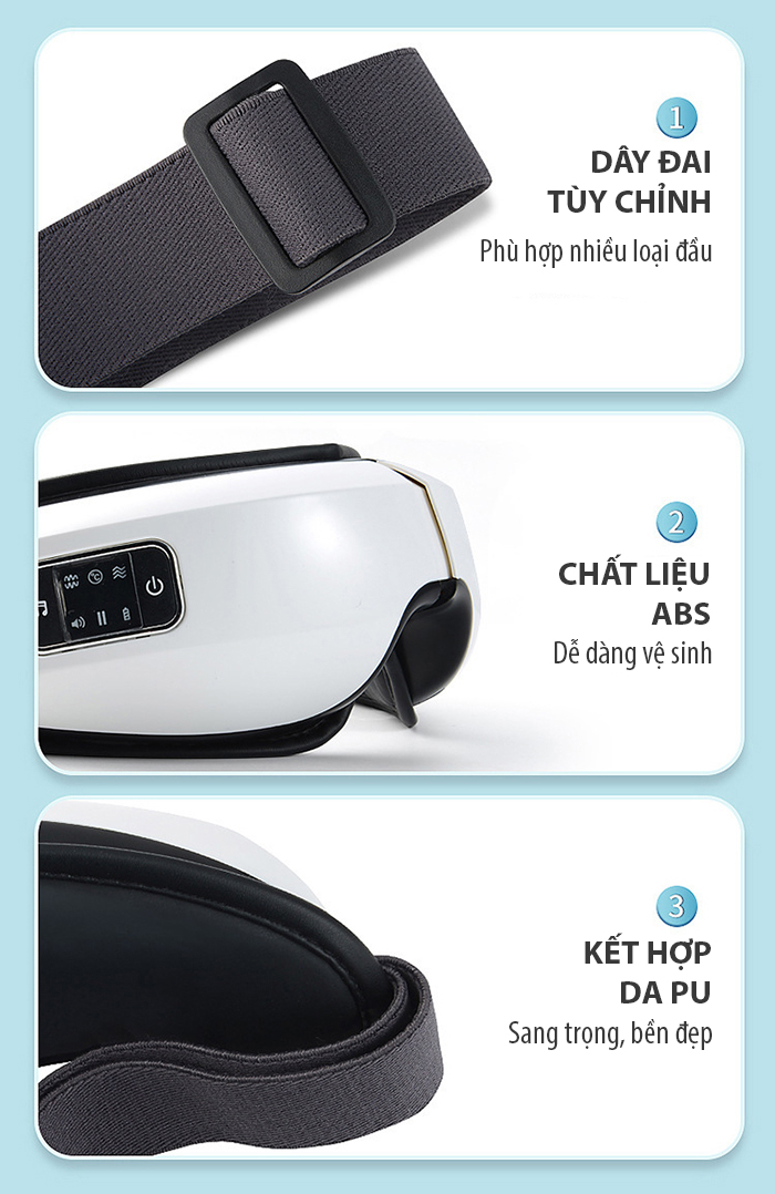 Tính năng Massage rung ở tần số cao kết hợp với công nghệ Massage túi khí giúp đôi mắt được thư giãn 1 cách tốt nhất, hỗ trợ làm giảm mệt mỏi, căng thẳng xung quanh mắt, hỗ trợ làm giảm các triệu chứng của thị giác như khô mắt, mỏi mắt, giữ cho đôi mắt khoẻ mạnh.Nhiệt nóng sưởi ấm mắt