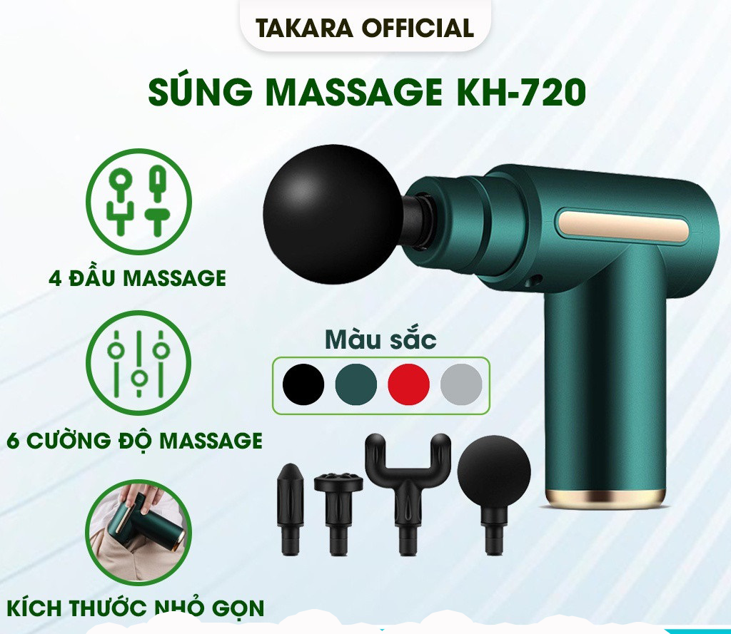 Súng Massage Mini Cầm Tay, Máy Mát Xa Trị Liệu Toàn Thân TAKARA Với 4 Đầu Thay Thế và 6 Cấp Độ KH720ƯU ĐIỂM KHI SỬ DỤNG SÚNG MASSAGE 720– Máy mát xa được thiết kế nhỏ gọn, dễ dàng sử dụng với ...