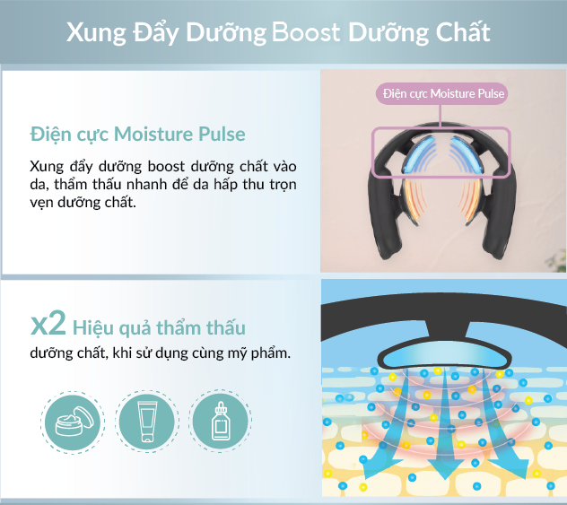 Xung Moisture Pulse tăng cường thẩm thấu dưỡng chất vào da nhanh và hiệu quả, dưỡng sáng da và làm da mịn màng.