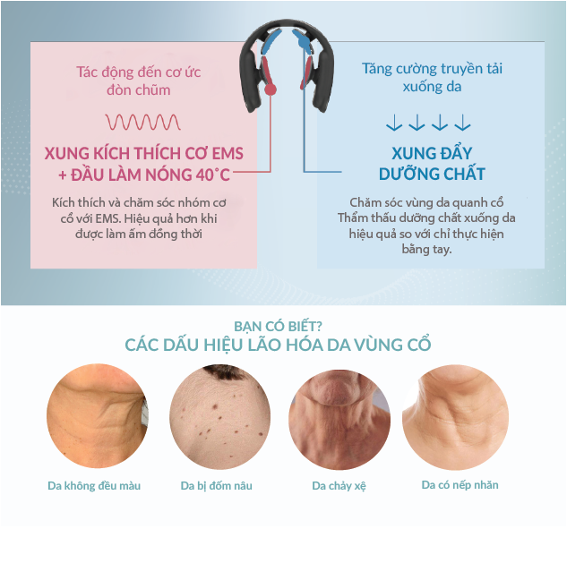 Medi Lift Neck EPN-10B sử dụng công nghệ EMS và Moisture Pulse cũng đầu điện cực làm nóng 40oC để cải thiện các dấu hiệu lão hóa và nuôi dưỡng da vùng cổ khỏe mạnh.