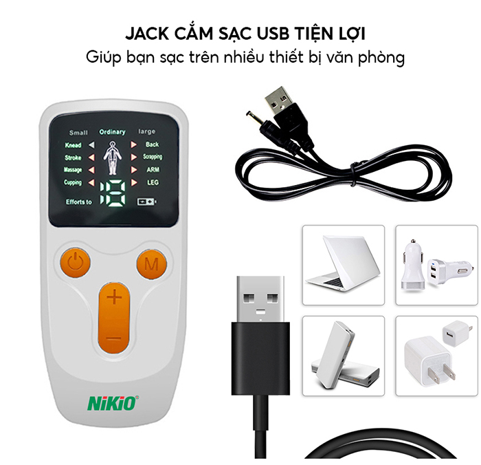 Máy matxa xung điện Nikio NK-101 sử dụng nguồn điện sạc đa dạng. Với điện áp sạc thông dụng 5VDC-1A, người dùng có thể sạc cho máy với nhiều nguồn như cóc sạc điện thoại, sạc dự phòng, cổng USB từ máy tính, ô tô