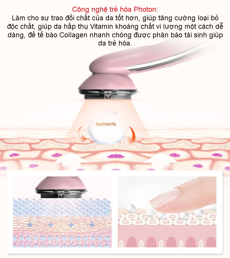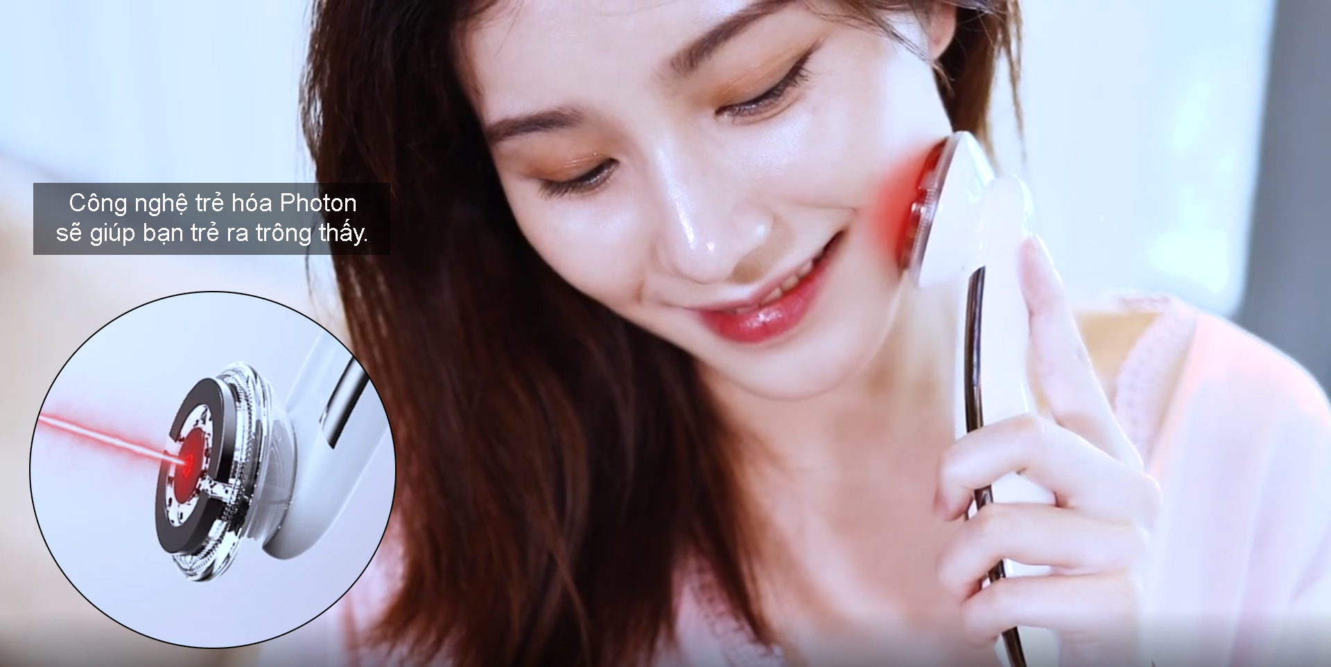Công nghệ trẻ hóa Photon: Làm cho sự trao đổi chất của da tốt hơn, giúp tăng cường lưu thông, giúp da hấp thụ Vitamin khoáng chất vi lượng một cách dễ dàng, để tế bào Collagen nhanh chóng được phân bào tái sinh giúp da trẻ hóa.