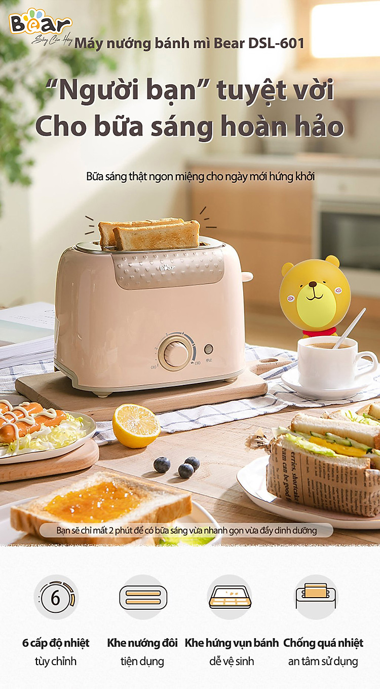 Chuẩn bị bữa sáng cho cả gia đình dễ dàng hơn với máy nướng bánh mì Bear DSL-601 thiết kế 2 khe nướng với 6 mức độ nhiệt nướng bánh khác nhau phù hợp với sở thích của nhiều người dùng. Cùng Bear Việt Nam trải nghiệm ngay phiên bản máy nướng bánh mi Bear DSL-601 thiết kế nhỏ gọn nhưng lại tiện lợi nhé!