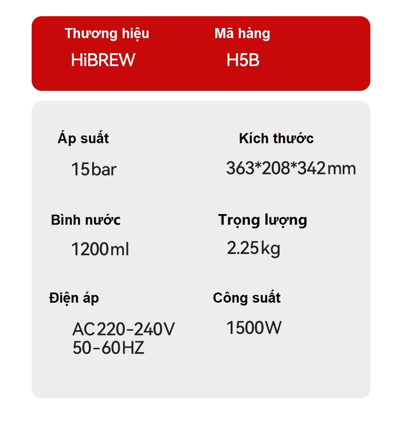 - Máy pha cà phê Espresso chuyên nghiệp HiBREW H5B có công suất hoạt động là 1500W, áp suất 15 bar. Đáp ứng được nhu cầu sử dụng tại các văn phòng, gia đình...