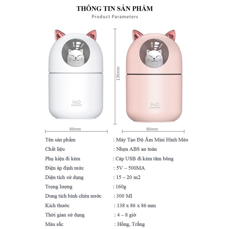 Máy Phun Sương Hình Mèo CTFAST-01: Dung Tích 300 ML, Cấp Ẩm Cho Da, Khuếch Tán Tinh Dầu, Ánh Sáng Thay Thế Đèn Ngủ: là sản phẩm tiện ích không thể thiếu trong phòng của bạn khắc phục tình trạng khô hanh, dưỡng ẩm cho da tạo cảm giác dễ chịu thoải mái đặc biệt là vào mùa hè nòng bức cũng như trong phòng điều hòa . 1.THÔNG TIN SẢN PHẨM. - Chất liệu: Nhựa ABS - Kích thước: 138*86*86cm - Trọng lượng: 160gr - Dung tích: 300ml - Thời gian sử dụng: 4-8 giờ - Điện áp định mức: 5V-500MA - Diện tích sử dụng: 15 - 20 m2 - Màu sắc: Trắng, Hồng ------------------------------------------------------- 2.ĐẶC ĐIỂM NỔI BẬT - Thiết kế thông mình nhỏ gọn nhưng dung tích vẫn đạt 300 ml thời gian sử dụng lên đến 8h giúp bạn yên tâm ngủ qua đêm mà không hề lo lắng tình trạng hết nước. - Hoạt động êm ái, không gây tiếng ồn ảnh hưởng đến giấc ngủ phù hợp với cả phụ nữ mang thai và trẻ nhỏ . - Thiết kế bắt mắt Màu sắc đa dạng : Trắng , Hồng có thể dùng để trang trí phòng - Ánh sáng êm dịu vào ban đêm có thể thay thế đèn ngủ .. BỘ SẢN PHẨM BAO GỐM Máy phun sương, cáp sạc USB, hướng dẫn sử dụng ------------------------------------------------------- 3.HƯỚNG DẪN SỬ DỤNG - Xoay ngược chiều kim đồng hồ để mở nắp. - Rút lõi tăm bông ra để thấm nước - Đổ nước vào, vặn chặt nắp lại - Cắm điện, nhấn nút nguồn để bắt đầu chế độ phun sương LƯU Ý: Không chọc lỗ phun sương. Nếu đèn tắt sau khi bật máy, nhấn giữ nút nguồn đèn sẽ sáng lại. -------------------------------------------------------
