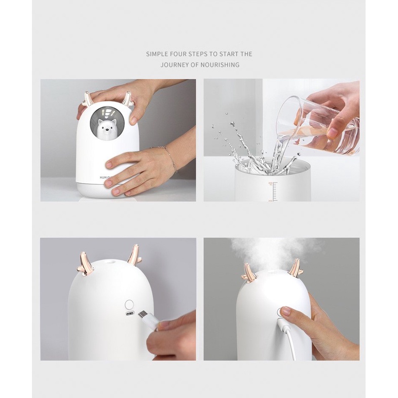 Nhà cửa & Đời sống > Chất khử mùi, làm thơm nhà > Máy khuếch tán, tạo ẩm & xông tinh dầu || Máy phun sương USB hình chú gấu trắng tai tuần lộc khuyếch tán tinh dầu tạo ẩm cấp ẩm để bàn có đèn