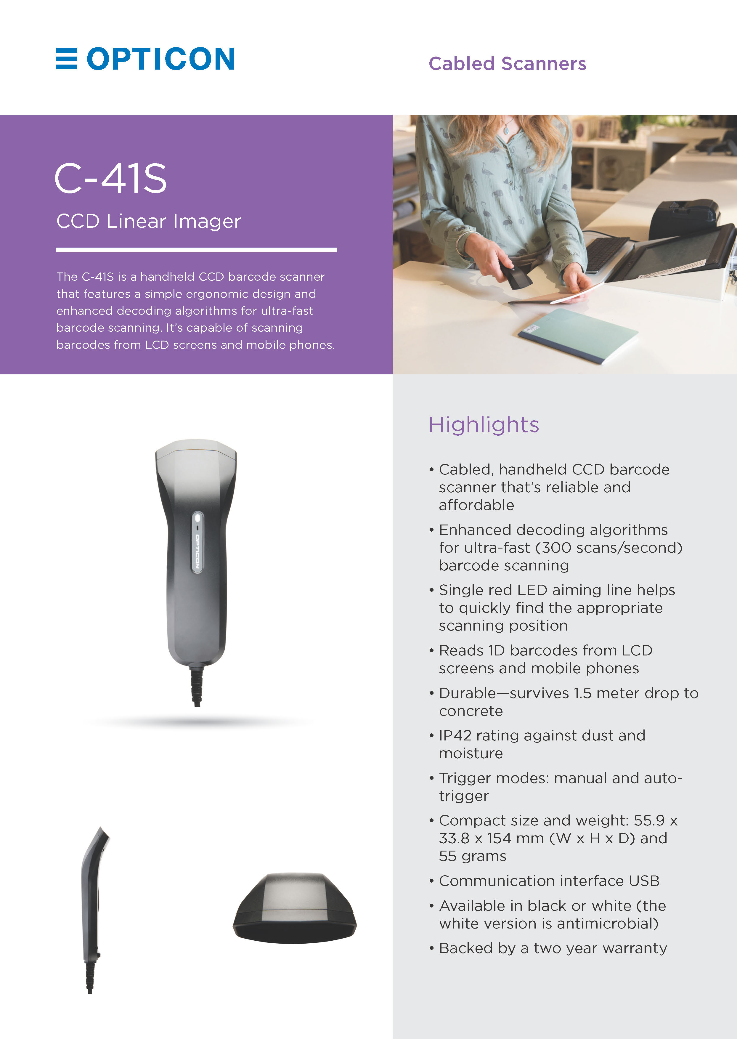 Máy quét mã vạch OPTICON C-41 có khả năng quét mã vạch từ màn hình LCD và điện thoại di động. Do màn hình quét rộng giúp cho việc quét tất cả các mã vạch 1D được dễ dàng hơn. Máy có cổng kết nối USB dễ dàng cài đặt và sử dụng chung với các hệ thống khác Như : Máy bán hàng POS, cân điện tử, Máy tính tiề