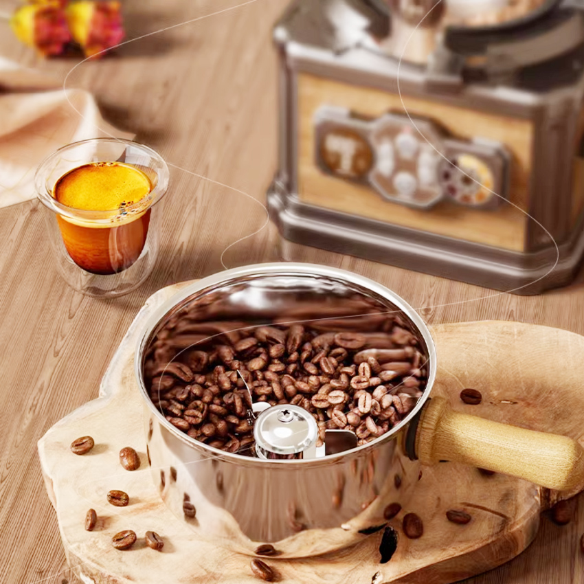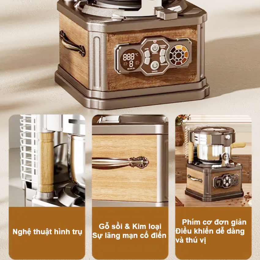 - Thân máy bằng nhựa gỗ sồi cao cấp, Hũ nướng inox 304 cao cấp chịu nhiệt, có nắp đậy bằng thủy tinh Boron, có thể dễ dàng kiểm tra sự thay đổi màu sắc của hạt cà phê trong quá trình rang. Với giỏ thu gom vỏ cà phê, giúp việc vệ sinh trở nên thuận tiện hơn.