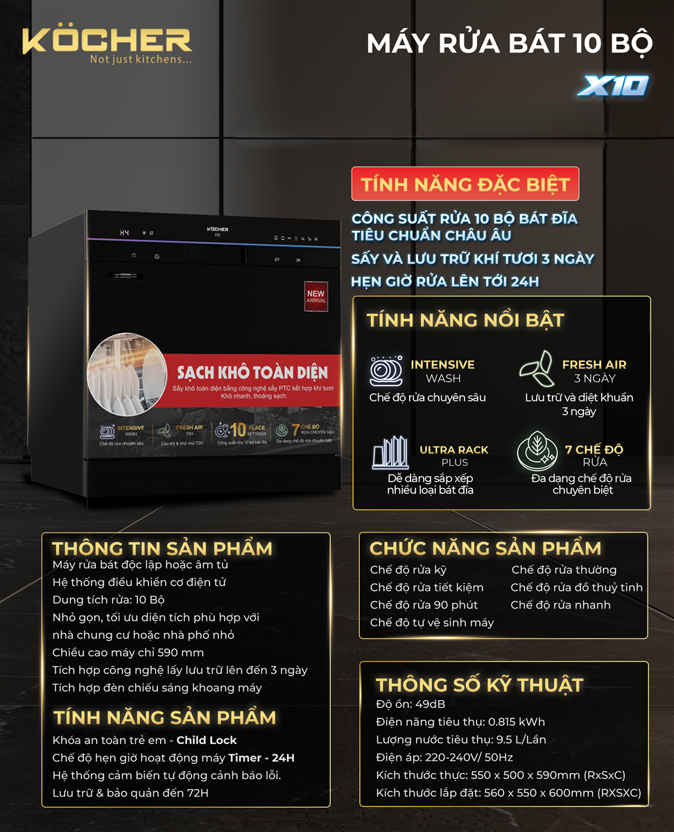 Số bộ chén bát rửa được | 10 bộ Châu Âu (~3 bữa ăn Việt) |