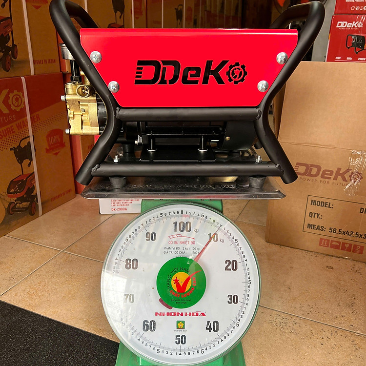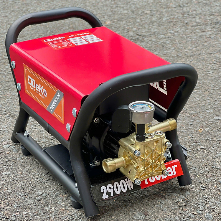 Máy xịt rửa áp lực cao DEKO DK-2900A là dòng máy rửa xe mini công suất lớn, được thiết kế tập trung vào áp lực phun mạnh mẽ trong một thân máy nhỏ gọn, rất phù hợp cho các gia đình có nhu cầu xịt rửa mạnh hoặc thợ vệ sinh công trình vào năm 2026. Dưới đây là thông số kỹ thuật và đặc điểm chi tiết: Thông số kỹ thuật DEKO DK-2900A Thuộc tính Chi tiết Công suất: 2900W (2.9 kW) Áp lực nước tối đa: 180 bar (Áp lực rất mạnh so với dòng mini) Lưu lượng nước: 10 Lít/phút Điện áp: 220V / 50Hz Động cơ: Mô tơ cảm ứng từ, lõi đồng 100% Trọng lượng: 10.00 kg Đường ống: Dây hút 2m, dây cao áp 15m Đặc điểm nổi bật Áp lực phun cực đại (180 bar): Đây là điểm khác biệt lớn nhất của model này. Với mức áp lực này, máy có khả năng đánh bay các vết bẩn siêu cứng đầu như xi măng bám trên công trình, rêu mốc lâu năm hoặc bùn đất khô cứng ở gầm xe tải nhỏ. Thiết kế tối ưu: Trọng lượng 10kg kết hợp với tay cầm chắc chắn giúp việc di chuyển giữa các khu vực vệ sinh trở nên đơn giản. Mô tơ cảm ứng từ: Đảm bảo máy vận hành bền bỉ, chạy êm và có khả năng tự hút nước từ xô chậu mà không cần mồi. Dây cao áp 15m: Chiều dài dây lớn giúp bạn rửa sạch một chiếc ô tô 7 chỗ hoặc vệ sinh khoảng sân rộng mà không cần phải di chuyển máy nhiều lần. Tính năng an toàn: Tự động ngắt khi nhả cò súng giúp bảo vệ động cơ và tiết kiệm điện nước tối đa. Ứng dụng thực tế Rửa xe chuyên sâu: Thích hợp cho ô tô, xe máy, đặc biệt là các xe thường xuyên đi công trường bám nhiều bùn đất. Vệ sinh công trình: Xịt rửa sàn bê tông, tường rào bám bẩn nặng. Vệ sinh chuồng trại: Áp lực mạnh giúp đẩy trôi chất thải nhanh chóng trên diện tích lớn. Vệ sinh gia đình: Sân vườn, ban công, cửa cuốn.