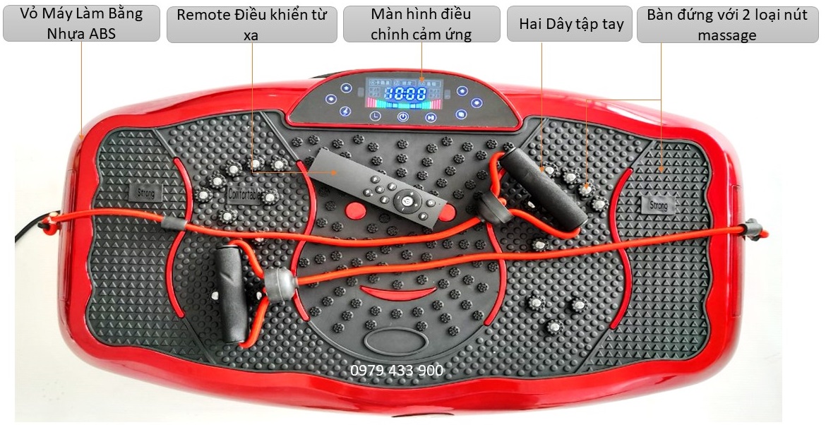 Model: FitNessĐiện áp 220v / 60HZCông xuất 350 WTốc Độ. 1 đến 100Trọng lượng 16 kgKích Thước máy 825 x 490 x 175 mm.Bảo hành 1 nămTổng đài 1900 98 68 29Hotline 0979 433 900Máy rung toàn thân fitness: có thiết kế với kích thước nhỏ gọn,phù hợp với mọi không gian. khung sườn chắc chắn chịu lực cao. Bàn đứng êm ái, khả năng chịu lực tốt thích hợp cho mọi lứa tuổi.Máy rung Fitness đang là sự lựa chọn hàng đầu tại các gia đình hiện nayTHIẾT KẾ SANG TRỌNG TỪNG CHI TIẾT Kiểu dáng sang trọng tinh tế phối với màu sắc hài hòa tạo cảm giác thư giãn thoải mái cho người tập, đồng thời sản phẩm có kích thước gọn nên bạn dễ đặt được bất cứ vị trí nào trong nhà để tập luyện.Trang bị động cơ rung mạnh mẽ, máy vận hành êm ái không gây ra tiếng ồn. Đặc biệt, hệ thống hoạt động càng mạnh càng đem đến hiệu quả nhanh chóng hơn. TÍNH NĂNG TIỆN LỢI CỦA MÁY RUNG Massage FitNess Với tính năng Rung 100 cấp độ và các chế độ rung tự động. bạn sẽ không cần bận tâm với cách luyện tập, máy rung Massage FitNess có lập trình các bài tập khoa học giúp người dùng thoải mái và hiệu quả. Trang bị dây kéo tập tay tăng thêm bài tập và hiệu quả luyện tập. Màn hình cảm ứng rộng lớn dễ nhìn rõ các thông số, tiện dụng kiểm tra và tùy chỉnh cho phù hợp sức khỏe. Remote điều khiển từ xa không chỉ thuận tiện để người dùng chọn chế độ rung Massage yêu thích mà còn quá tiện lợi khi bạn tắt mở máy, bật nhạc…