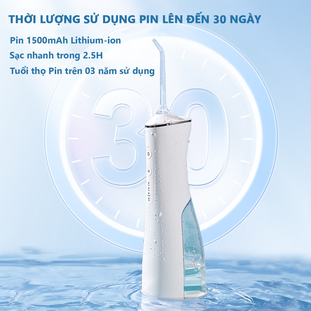 Với kỹ thuật tạo xung độc đáo được nâng cấp, máy có áp suất nước cao khoảng 1400-1800 lần/ phút, áp lực nước mạnh 50-140PSI, đầu tăm xoay 360° giúp loại bỏ 99,99% mảng bám thức ăn sâu trong các kẽ răng, làm sạch cả mặt trong và ngoài, chế độ Massage nướu thúc đẩy tuần hoàn máu, cải thiện sức khoẻ răng lợi. Đặc biệt hiệu quả tốt cho bệnh nhân thường xuyên chảy máu chân răng, viêm lợi, hôi miệng, chỉnh nha và làm cầu răng, bọc sứ.
