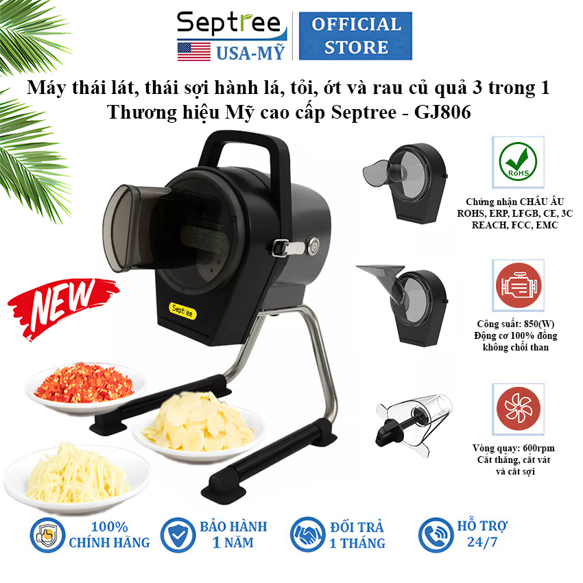 Máy thái lát, thái sợi hành lá, tỏi, ớt và rau củ quả nhà hàng, gia đình và khách sạn là dụng cụ hỗ trợ đắc lực cho các đầu bếp khi vào bếp. Chiếc máy này sẽ giúp đầu bếp và chị em tiết kiệm thời gian và công sức gấp nhiều lần. Nó sẽ là người bạn đồng hành cùng các đầu bếp. Sau đây chúng tôi giới thiệu Máy thái lát, thái sợi hành lá, tỏi, ớt và rau củ quả cao cấp 3 trong 1 Septree GJ806. Hiện được xem là giải pháp tối ưu tiết kiệm thời gian, chi phí nhân công, tối đa hóa lợi nhuận cho việc chế biến rau củ số lượng lớn. Máy có thể cắt đa năng như: Cắt ớt, hành lá, tỏi, cắt sợi nhỏ,...Thành phẩm đều đẹp như 1, hạn chế hao hụt nguyên liệu.