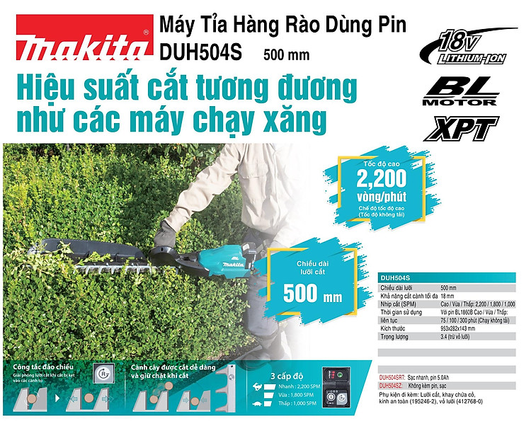 Trong hộp có: Máy tỉa hàng rào Makita DUH504SRT, Lưỡi cắt, Khay chứa cỏ, Kính bảo hộ, Vỏ lưỡi, Sạc nhanh, 1 pin 18v 5.0 Ah.