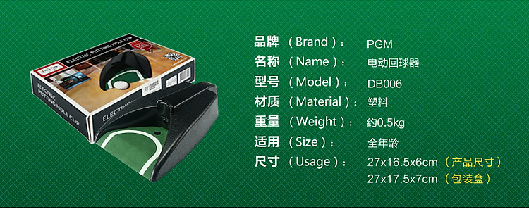 Tên sản phẩm: PGM DB006 Auto-Return Putting Cup1. Thông số kỹ thuật:Mã sản phẩm: DB006Kích thước: 27cm x 16.5cm x 6cm Trọng lượng: khoảng 0.5kg Màu sắc: Đen 2. Chất liệu:Máy trả bóng golf gắ...