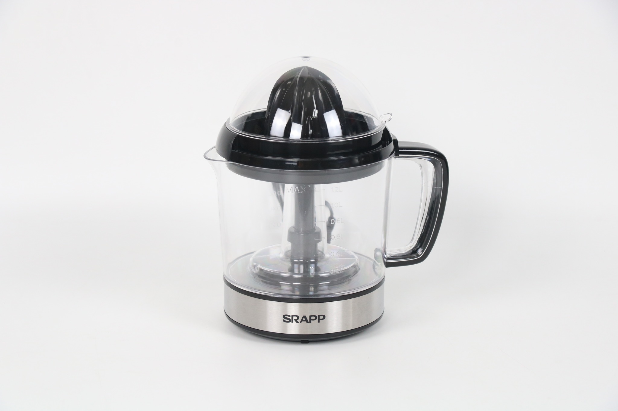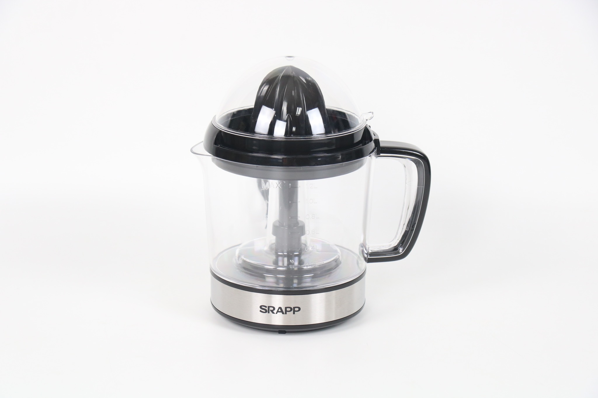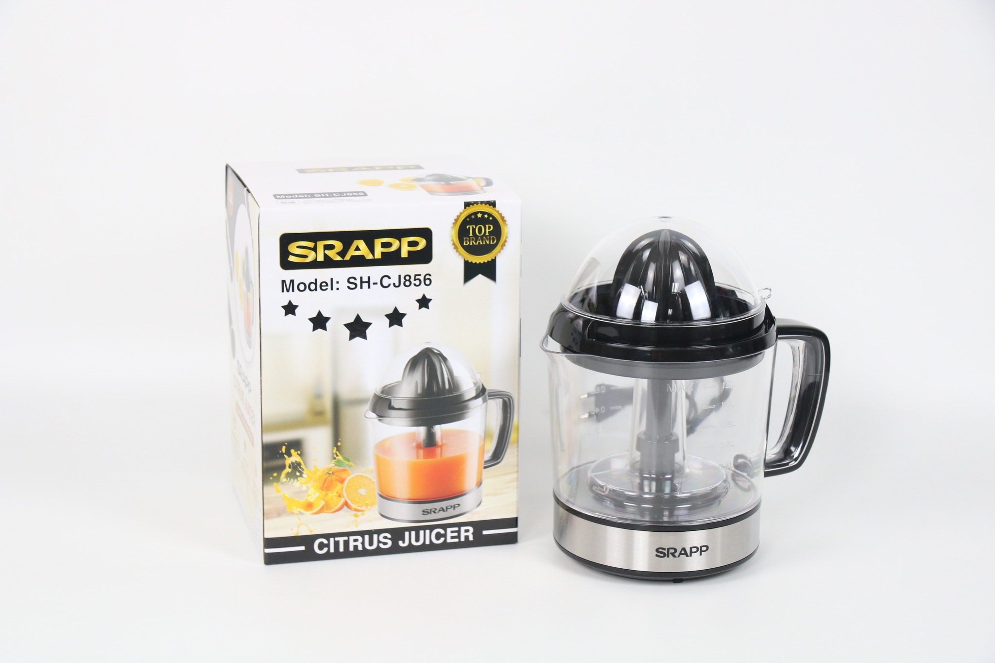 Máy Vắt Cam SRAPP SH-CJ856 có thiết kế kết màu đen và kết hợp đế inox sáng bóng sang trọng, đặc biệt với chóp nón liên tục xoay trái và phải để tách nước trái cây hoàn toàn khỏi vỏ giúp cho chúng ta vắt nước cam thật là dễ dàng và nhanh chóng.
