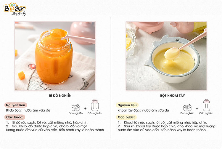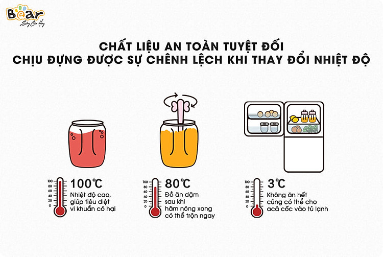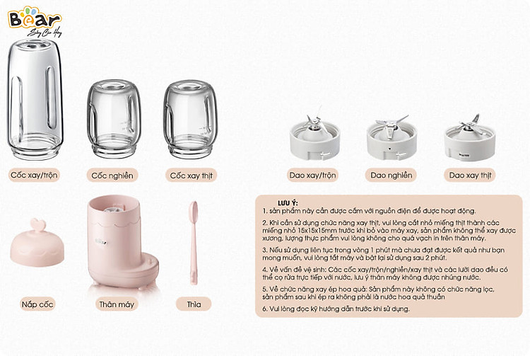 Ngoài công năng và kiểu dáng tinh tế, đi kèm máy xay ăn dặm 3 cối Bear GR-B03V1 (LLJ-C04J1) còn có các phụ kiện như muỗng ăn dặm thiên thần, nắp bảo quản thực phẩm. Các phụ kiện đều được làm từ nhựa PP an toàn thực phẩm nên phù hợp sử dụng với trẻ em.