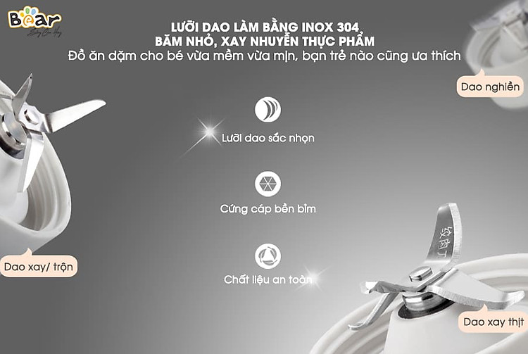 Tương tự như các loại cối xay, bộ máy xay ăn dặm 3 cối Bear cũng đi kèm 3 loại lưỡi dao tương ứng, có khắc chữ các công dụng như cối xay. Lưỡi xay được làm bằng inox SUS304 không gỉ, chắc chắn đáp ứng mọi nhu cầu xay.