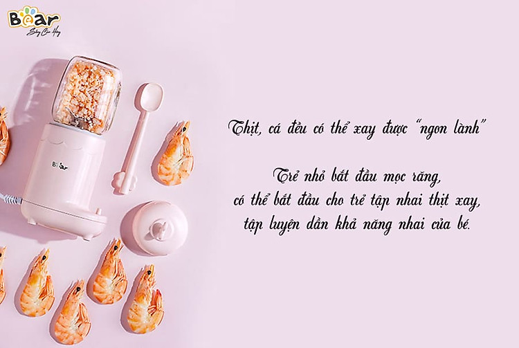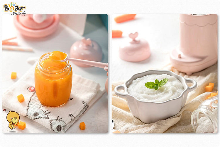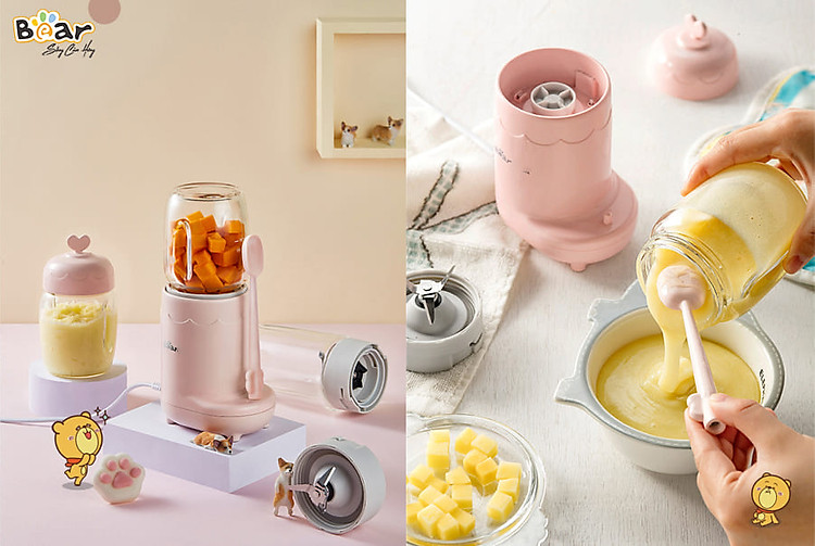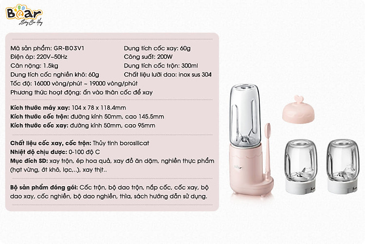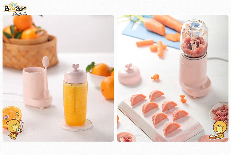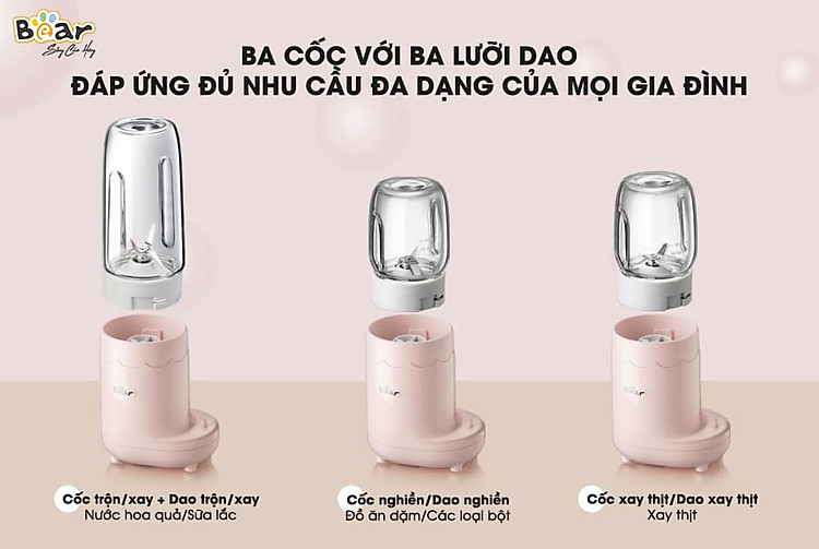 Máy xay ăn dặm 3 cối Bear LLJ-C04J1 (GR-B03V1) màu hồng đáng yêu, rất phù hợp với không gian bếp hiện đại. Máy được thiết kế với 3 dáng cối xay thủy tinh khác nhau bền chắc, an toàn cho sức khỏe, đặc biệt an tâm khi dùng xay thực phẩm ăn dặm cho bé.
