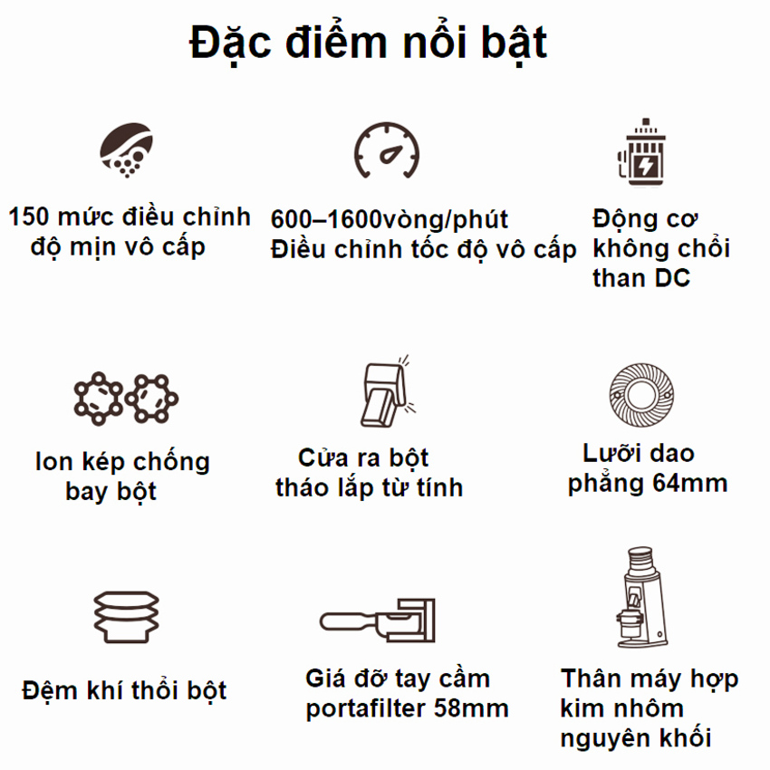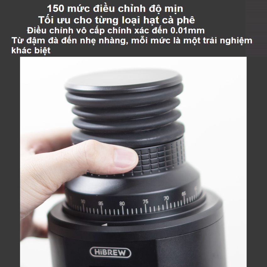 - Điều chỉnh cỡ xay vô cấp: Cho khả năng vi chỉnh kích thước bột với mức siêu nhỏ. Tối ưu cho từng loại hạt cà phê, điều chỉnh vô cấp chính xác đến 0.01mm