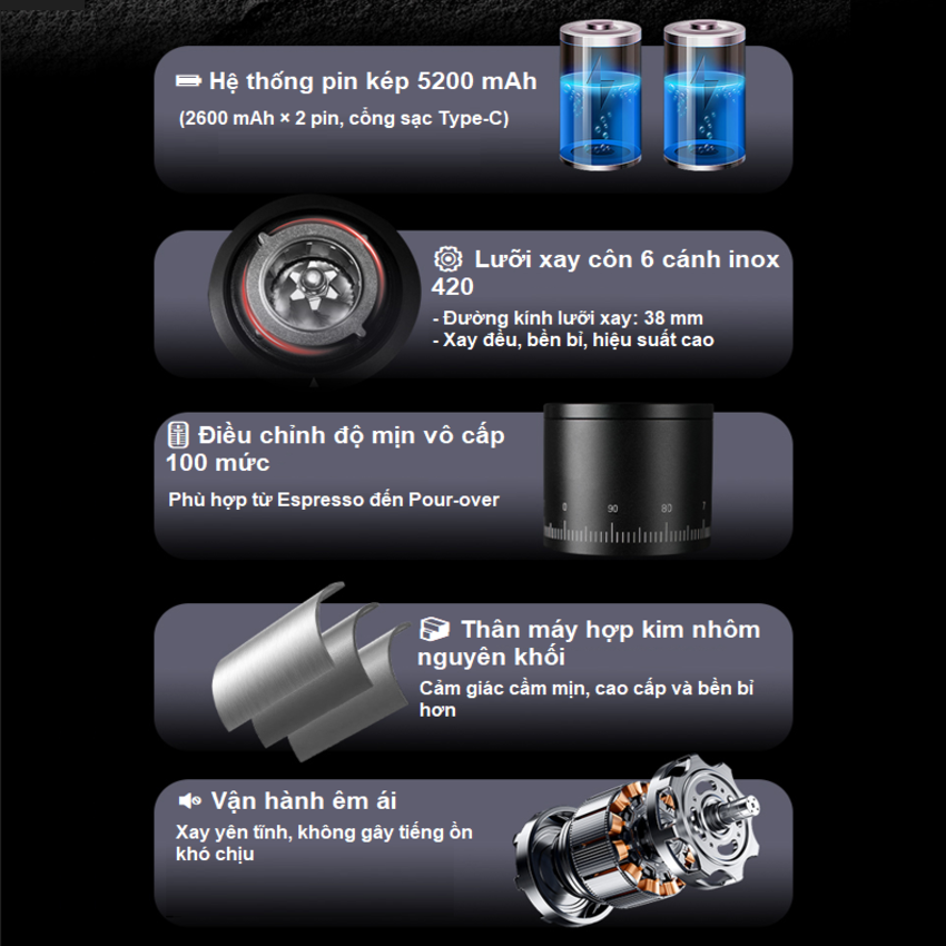 - Lưỡi xay: Kích thước 38mm, hình nón, bằng thép CNC