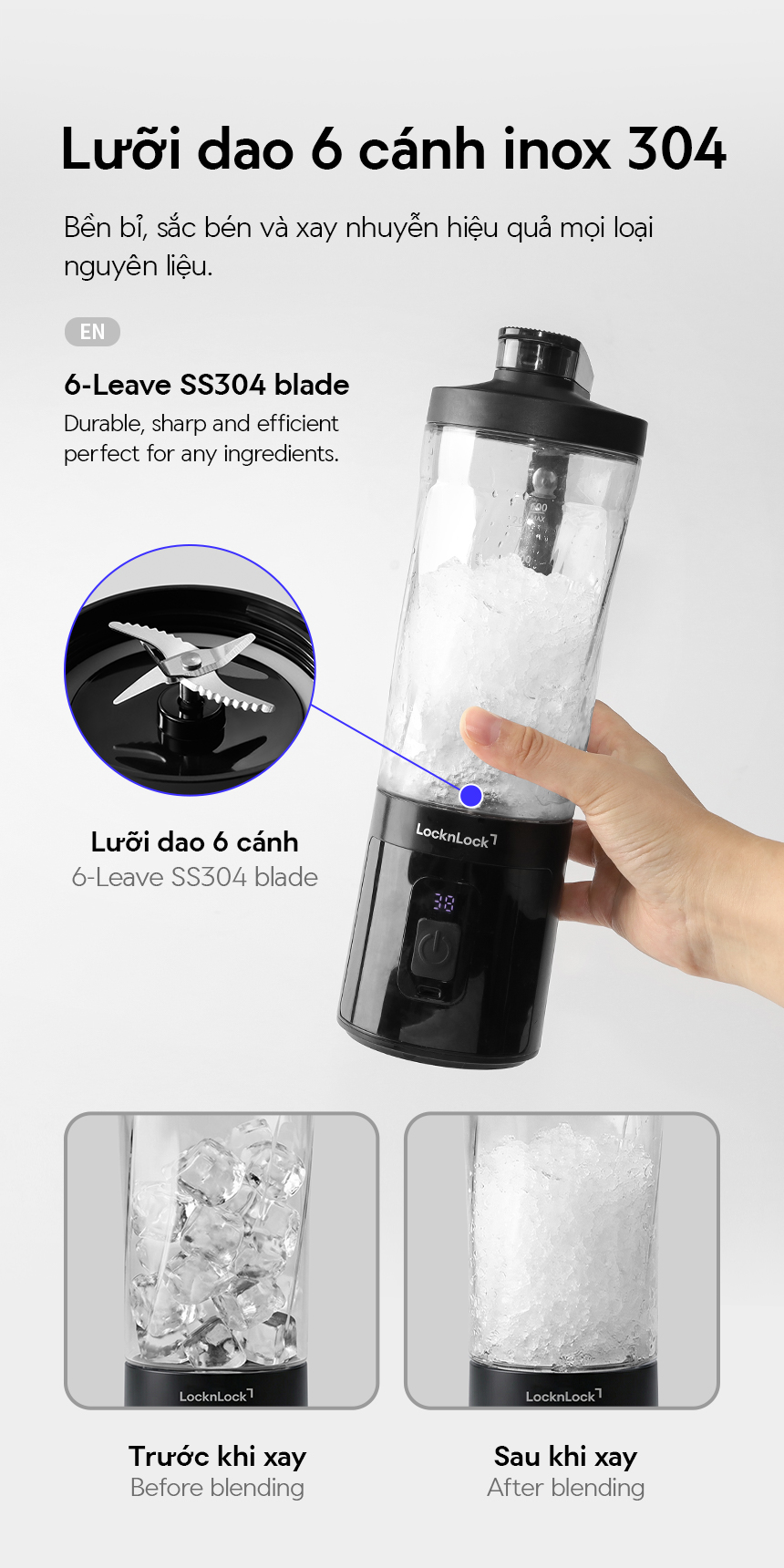 - LƯỠI DAO INOX 304 6 CÁNH: Bền bỉ, sắc bén và xay nhuyễn hiệu quả mọi loại nguyên liệu