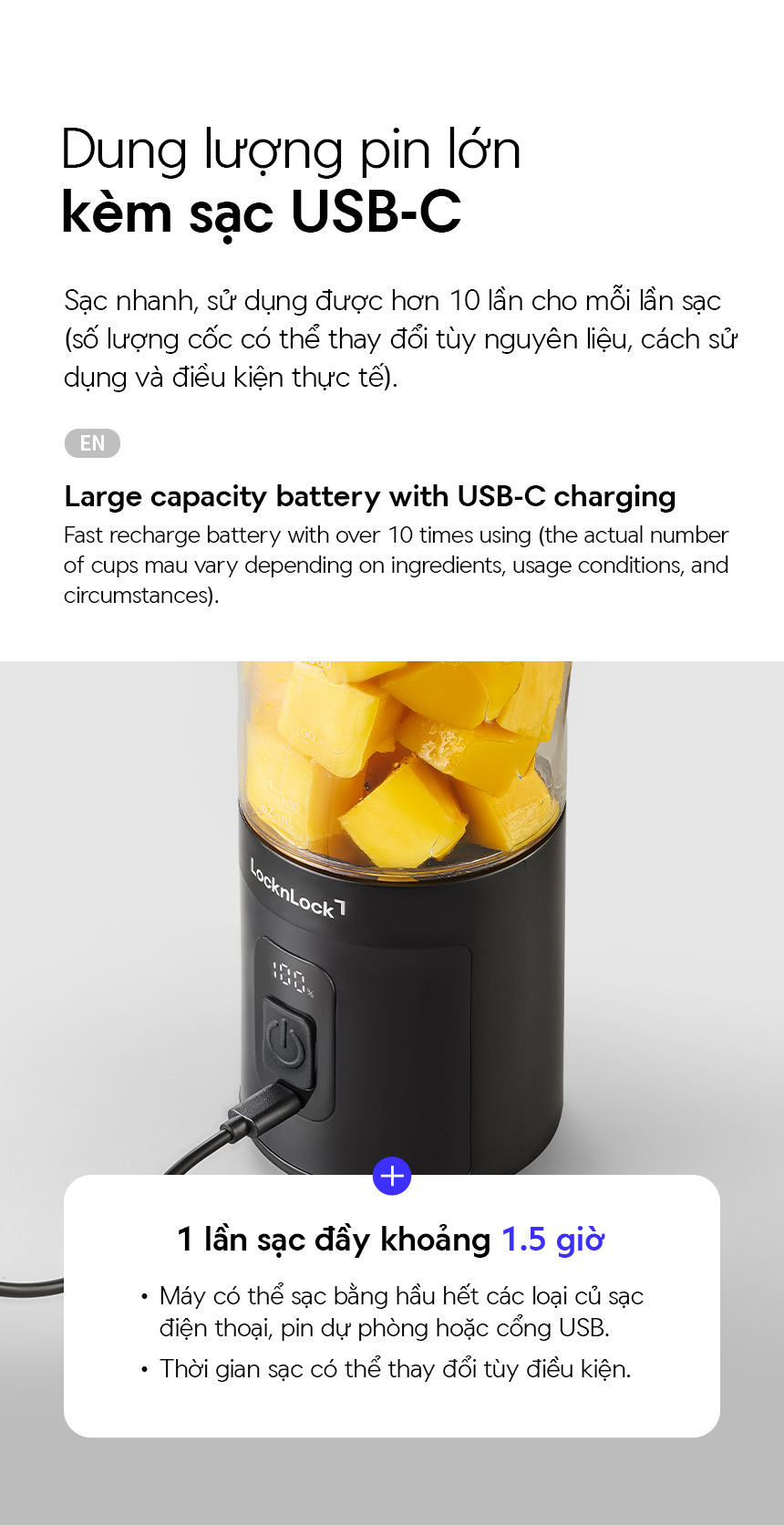 1 LẦN SẠC ĐẦY KHOẢNG 1.5H: Làm được khoảng 10-12 cốc nước ép