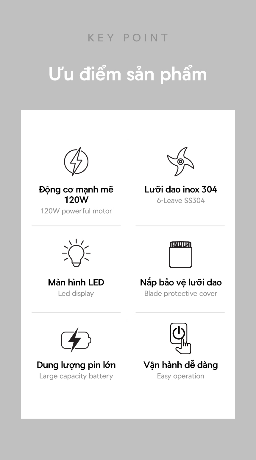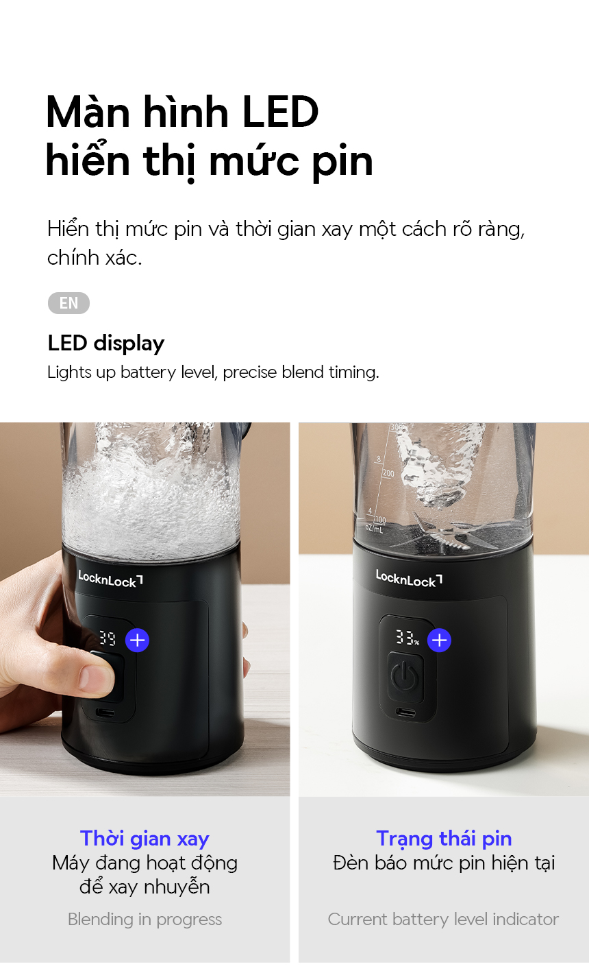 - MÀN HÌNH LED: Hiển thị mức pin và thời gian xay một cách rõ ràng, chính xác