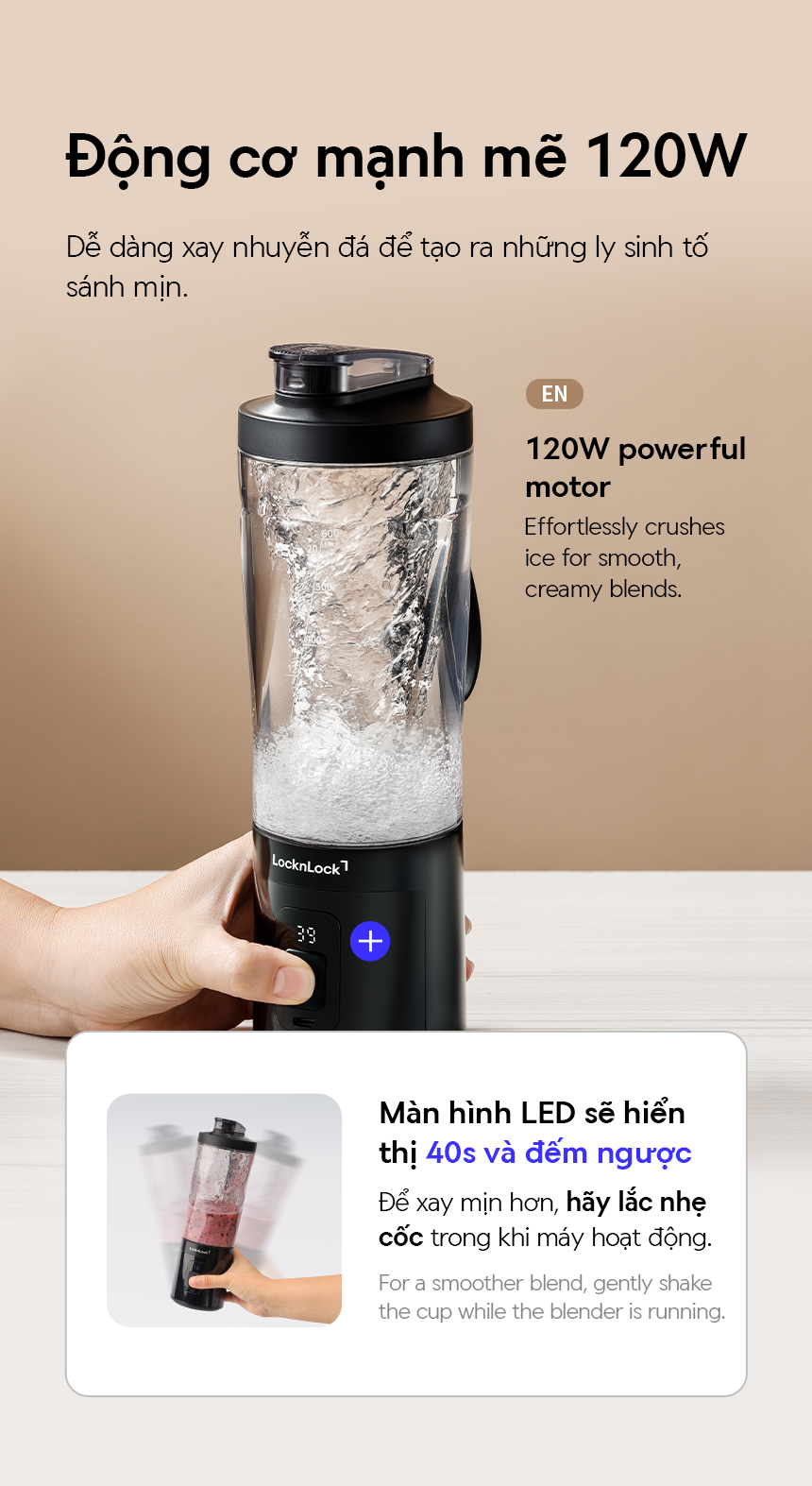 - ĐỘNG CƠ MẠNH MẼ 120W : Dễ dàng xay nhuyễn đá để tạo ra những ly sinh tố sánh mịn.