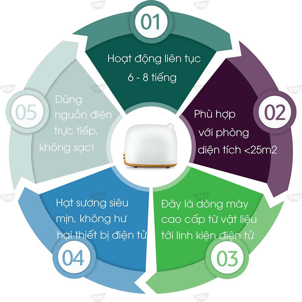 Đặc điểm nổi bật của máy khuếch tán tinh dầu KB-29K của Kobi? - Máy có dung tích vừa phải (300ml), có thể hoạt động liên tục trong 6-8 giờ liên tục. - Phù hợp với phòng <25m2. - Dùng nguồn điện trực tiếp (không dùng sạc). - Có thể hẹn giờ hoặc tự tắt khi hết nước. - Tiết kiệm tinh dầu, tinh dầu khi chỉ cần 3-5 giọt tinh dầu nguyên chất cho 100ml nước. - Tiêu chuẩn Châu Âu, Máy Bền, Chạy Êm, Tuyệt đối An Toàn cho Trẻ Nhỏ, được khách hàng phân khúc Cao Cấp Tin Dùng. - Sóng siêu âm tách các phân tử nước đủ nhỏ để phân tán trong không gian, giúp lan tỏa tinh dầu hiệu quả, tăng độ ẩm phù hợp với phòng máy lạnh mà không làm hư hại các thiết bị điện tử. - Mang hương thơm tự nhiên đến căn phòng của bạn, giúp thanh lọc không khí, loại bỏ mùi khó chịu của vật nuôi trong nhà bạn. - Thiết kế ấn tượng, mang ý nghĩa may mắn, tốt lành trong phong thủy, hạnh phúc trong hôn nhân, trường thọ,… - Màu sắc tinh tế phù hợp với nhiều không gian khác nhau từ phòng khách, phòng ngủ, phòng làm việc, phòng trẻ nhỏ, spa,… - Món quà ý nghĩa dành cho bạn bè, gia đình trong những dịp lễ tết, khai trương, tân gia,…