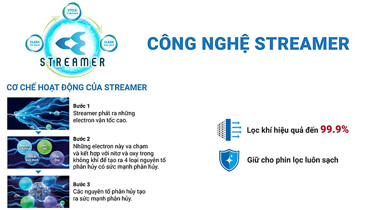 Công nghệ Streamer (3C) độc quyền giúp phân hủy đến 99.9% virus, vi khuẩn, nấm mốc,... và giúp phục hồi hiệu suất phin lọc mùi, phin lọc bụi HEPA