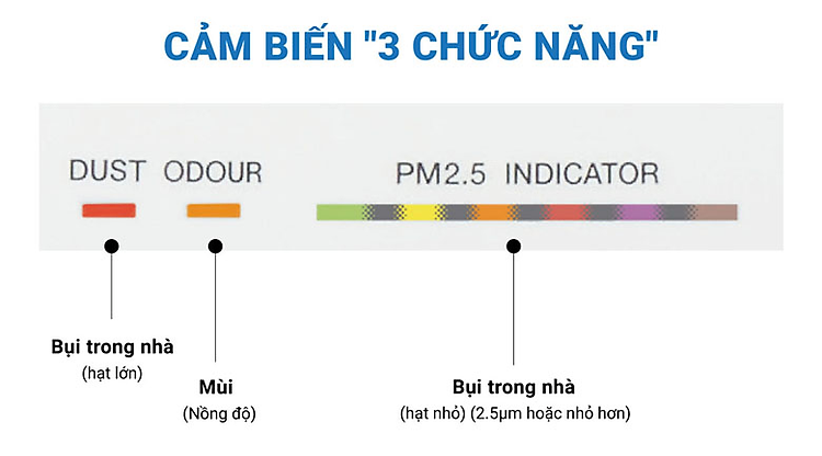 Máy lọc không khí được trang bị cảm biến "3 chức năng" thông minh, nhanh chóng phát hiện bụi mịn PM2.5, bụi thường và mùi hôi