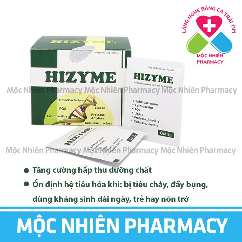 Men Tiêu Hóa Cho Bé, Men Vi Sinh Cho Bé, Men Hizyme, Tiêu Hóa Tốt, Ăn Ngon Miệng, Tăng Cường Hấp Thu Dưỡng Chất ================================================================================= 1. Đặc điểm nổi bật của Men Hizyme + Men Hizyme là một sản phẩm toàn diện trong chăm sóc sức khỏe hệ tiêu hóa của trẻ. Men Hizyme là sự kết hợp của 3 nhóm đó là: các vi sinh vật có ích cho đường ruột, các men tiêu hóa và các vitamin nhóm B giúp cho bé dễ dàng tiêu hóa được nhiều nhóm thực phẩm như chất đường bột, chất đạm, chất béo, chất xơ. + Men Hizyme được bào chế ở dạng bột, dễ hòa tan trong nước tạo sản phẩm có màu vàng chanh hấp dẫn, hương trái cây thơm ngon, vị ngọt mát dễ uống + Men Hizyme có công dụng: - Hỗ trợ tăng cường tiêu hóa, làm giảm các triệu chứng của rối loạn tiêu hóa như: tiêu chảy, táo bón, đầy bụng, khó tiêu do loạn khuẩn ruột - Hỗ trợ tăng cường hấp thu dưỡng chất ================================================================================= 2. Những ai nên dùng sản phẩm men Hizyme? - Dùng cho trẻ em, người lớn bị đầy bụng, khó tiêu, tiêu chảy, táo bón do loạn khuẩn ruột - Trẻ chậm tăng cân ================================================================================= 3. Hướng dẫn sử dụng: - Trẻ từ 2 – 6 tuổi: 2-3 gói/ngày, chia 2 lần - Trẻ từ 7-10 tuổi: 3-4 gói/ngày chia 2 lần - Người lớn: 4 gói/ngày chia 2 lần - Pha một gói với 10-20ml nước ấm, uống trực tiếp sau bữa ăn - Trẻ dưới 2 tuổi sử dụng tham khảo ý kiến của thầy thuốc ================================================================================= 4. Thành phần trong 1 gói 3g Lactobacillus 108 CFU Bifidobacterium 108 CFU Amylase 1100 IU Protease 300 IU Lactase 210 IU Lipase 50 IU Cellulase 11 IU FOS 1500 mg Kẽm gluconat 4 mg Vitamin B6 0,5 mg Vitamin B1 0,45 mg Vitamin B12 0,6 mcg ================================================================================ 5. Quy cách đóng gói: Hộp 30 gói x 3gam Sản phẩm không phải là thuốc không có tác dụng thay thế thuốc chữa bệnh #mocnhienpharmacy #menvisinhchobe #mentieuhoachobe #menvisinh #mentieuhoa #taangsucdekhang #anngon #tanghapthu #hotroanngon ================================================================================ MỘC NHIÊN PHARMACY Có Dược sĩ Đại học Dược Hà Nội trên 10 năm kinh nghiệm, tư vấn cho khách nhiệt tình, chu đáo. Cam kết hàng chính hãng, nguồn gốc xuất xứ rõ ràng, giá hợp lý, chủng loại hàng đa dạng Trực shop 24/7 Tư vấn trực tiếp liên hệ ĐT-Zalo: 097.936.9521 Hỗ trợ ship cho đơn từ 50.000