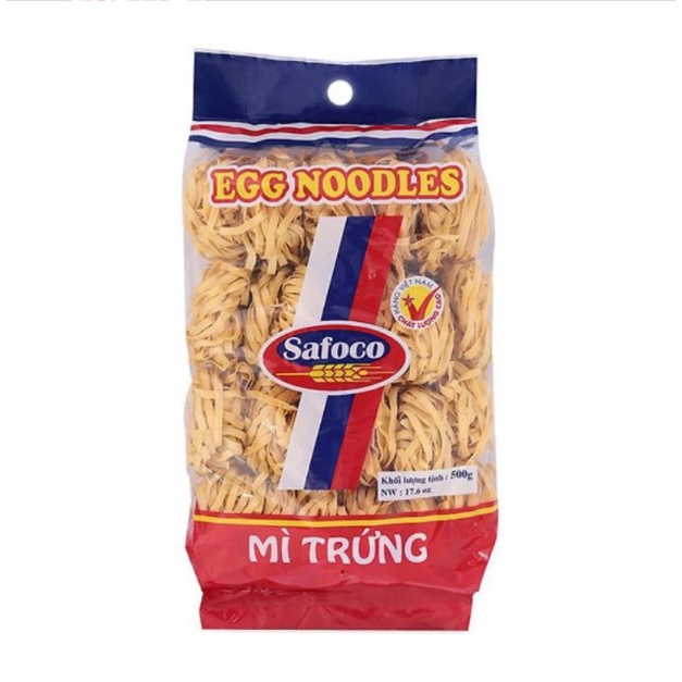 Mì Trứng Safoco Sợi Nhỏ/Sợi Lớn Gói 500G Mì trứng Safoco có thành phần chính từ bột gạo và trứng được chọn lọc cẩn thận và sản xuất trên dây chuyền hiện đại khép kín, không sử dụng phụ gia độc hại nên tuyệt đối an toàn với sức khỏe người tiêu dùng. Thành phần: Bột gạo, trứng (1.5%, đã qua kiểm dịch), muối ăn, chất ổn định, màu thực phẩm tổng hợp… Hướng dẫn sử dụng: Cho các vắt mì vào nước đang sôi, nấu khoảng 3 - 4 phút. Thỉnh thoảng đánh tơi vắt mì cho chín mềm, vớt mì ra, bỏ vào nước lạnh. Đánh tơi sợi mì rồi vớt ra để ráo nước, trộn một muỗng dầu thực vật để các sợi mì không dính vào nhau. Xào, nấu mì tùy theo sở thích ăn của mỗi người. Đóng gói nhỏ gọn tiện lợi Chế biến theo công nghệ hiện đại Hướng dẫn bảo quản: Nơi khô ráo, thoáng mát, tránh ánh nắng trực tiếp. Sản xuất tại Việt Nam Safoco là thương hiệu của Việt Nam